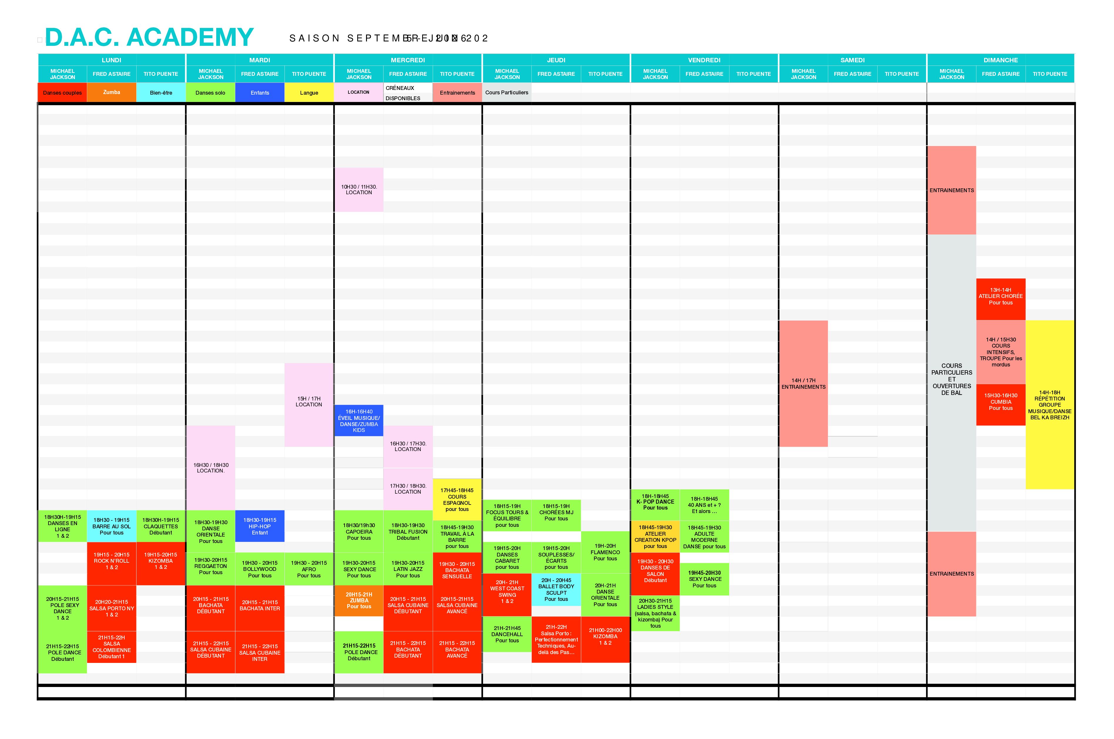 Planning des cours de danse Avec plus de 50 cours de danse au planning, vous trouverez forcément une activité pour vous ! Pour des cours particuliers,contactez-nous ! Saison 2025-2026 Téléchargez le planning des cours 2025-2026 Inscriptions 2025-2026